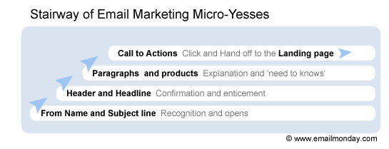 Σε αυτά τα σκαλοπάτια, όπως προαναφέρθηκαν, πρέπει να πάμε από το ένα στο άλλο με προσεκτικές κινήσεις. Το όνομα και το θέμα θα πρέπει να προκαλεί τον χρήστη να το ανοίξει. Το επάνω μέρος (header) θα πρέπει να εξηγεί για το τί περιέχει το email μας και να κρατήσει την προσοχή. Στο κυρίως σώμα του κειμένου πρέπει να πειστεί ο χρήστης να πατήσει στον σύνδεσμο και τέλος, να προωθηθεί στην σελίδα αγοράς.